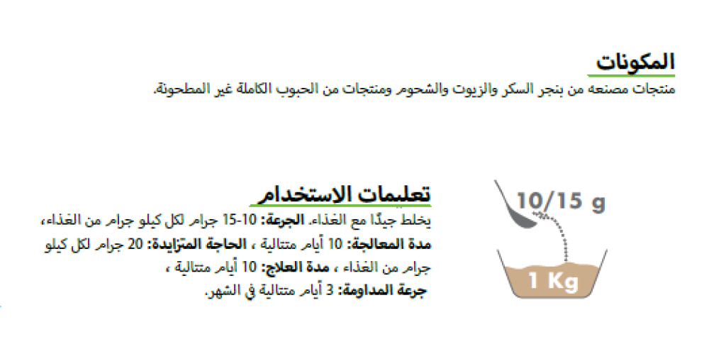 حيوي وفعال عالي جدًا. يوصى به من الايام الاولي من العمر ولمدة عام. يخلط مع الغذاء ويعزز استساغة وطعم الغذاء