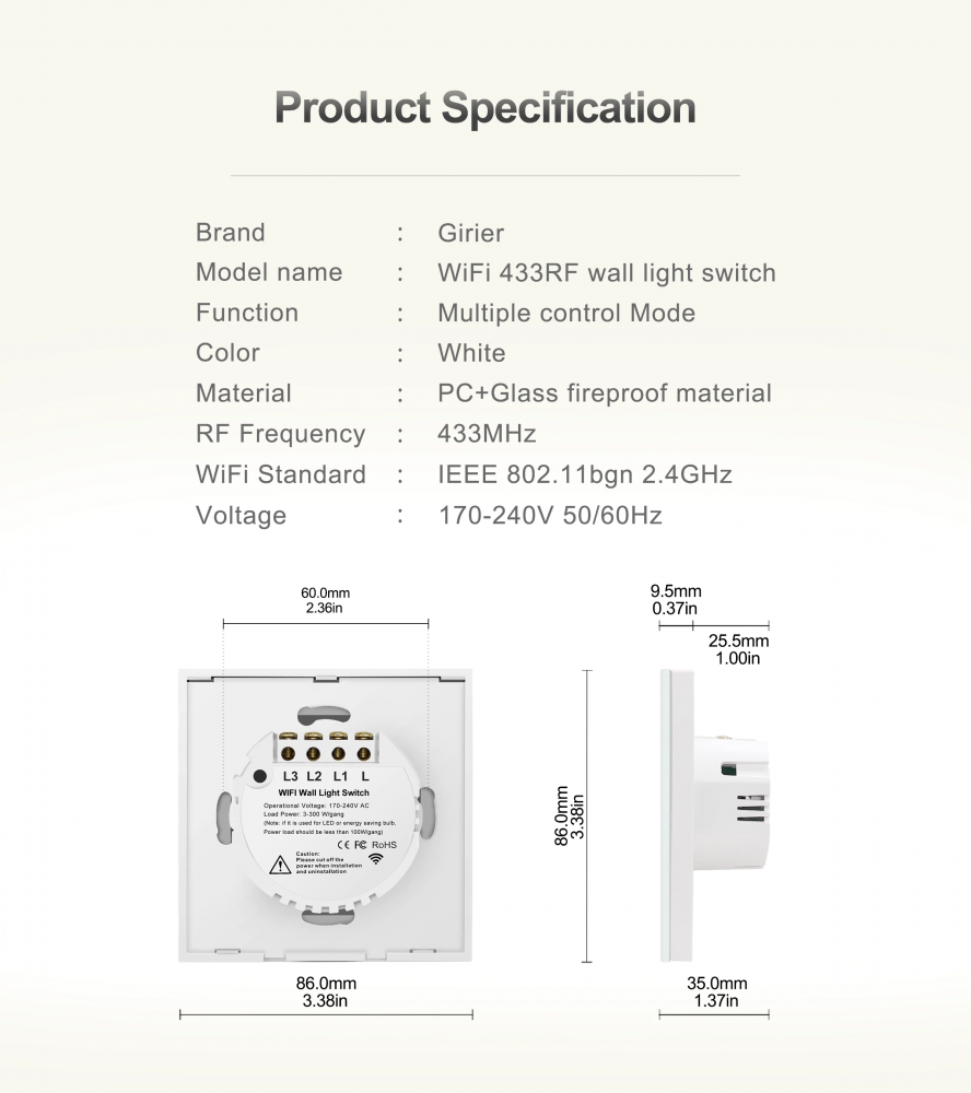GIRIER EU wall touch switch made of toughened glass and flame-retardant PC. It doesn’t need neutral wire for installation, which allows you save a lot of time to install. The sturdy and durable toughened glass is very easy to clean that makes your life be worriless.